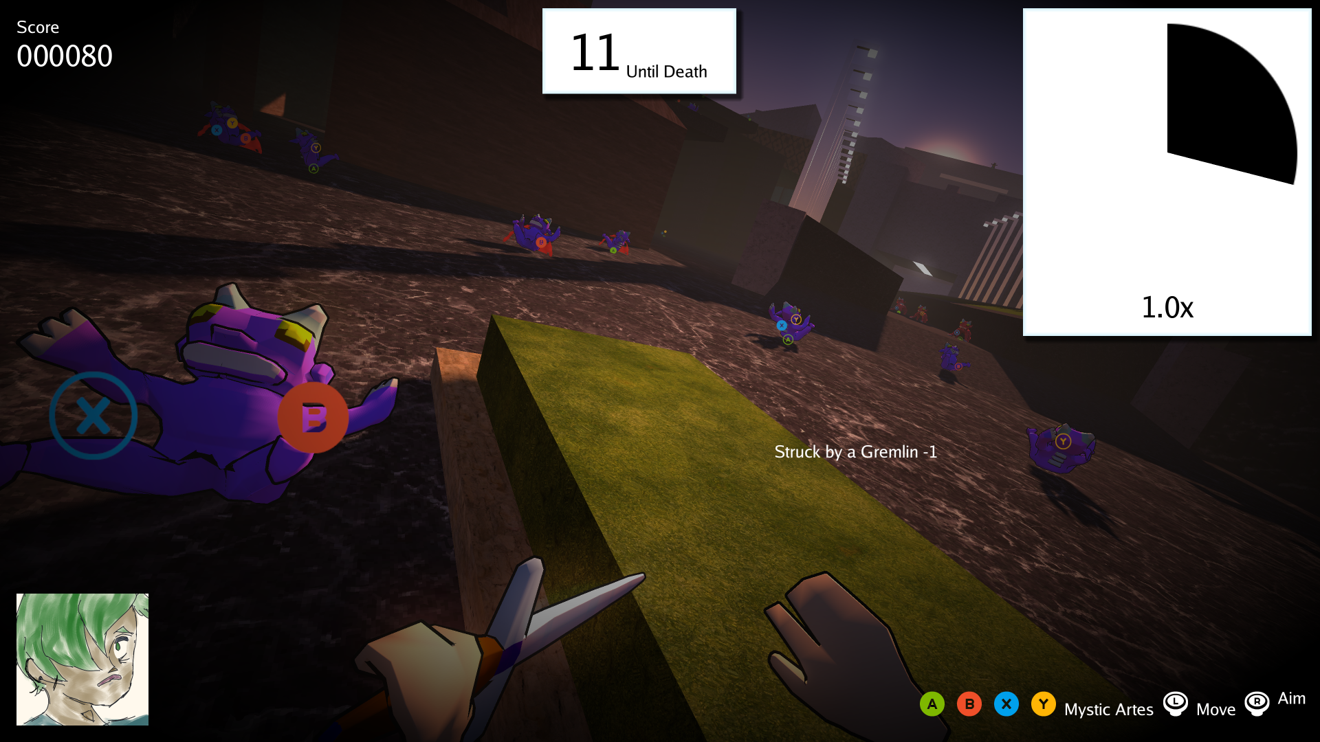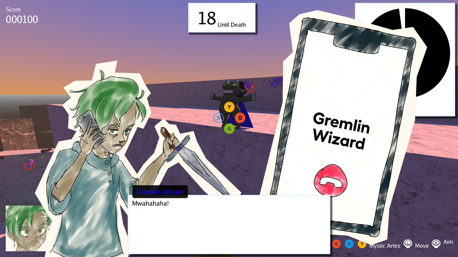 The Green-Haired Fool awakens cursed by the Gremlin Wizard. Use the mystic artes to make Gremlins vulnerable. Don't die!
